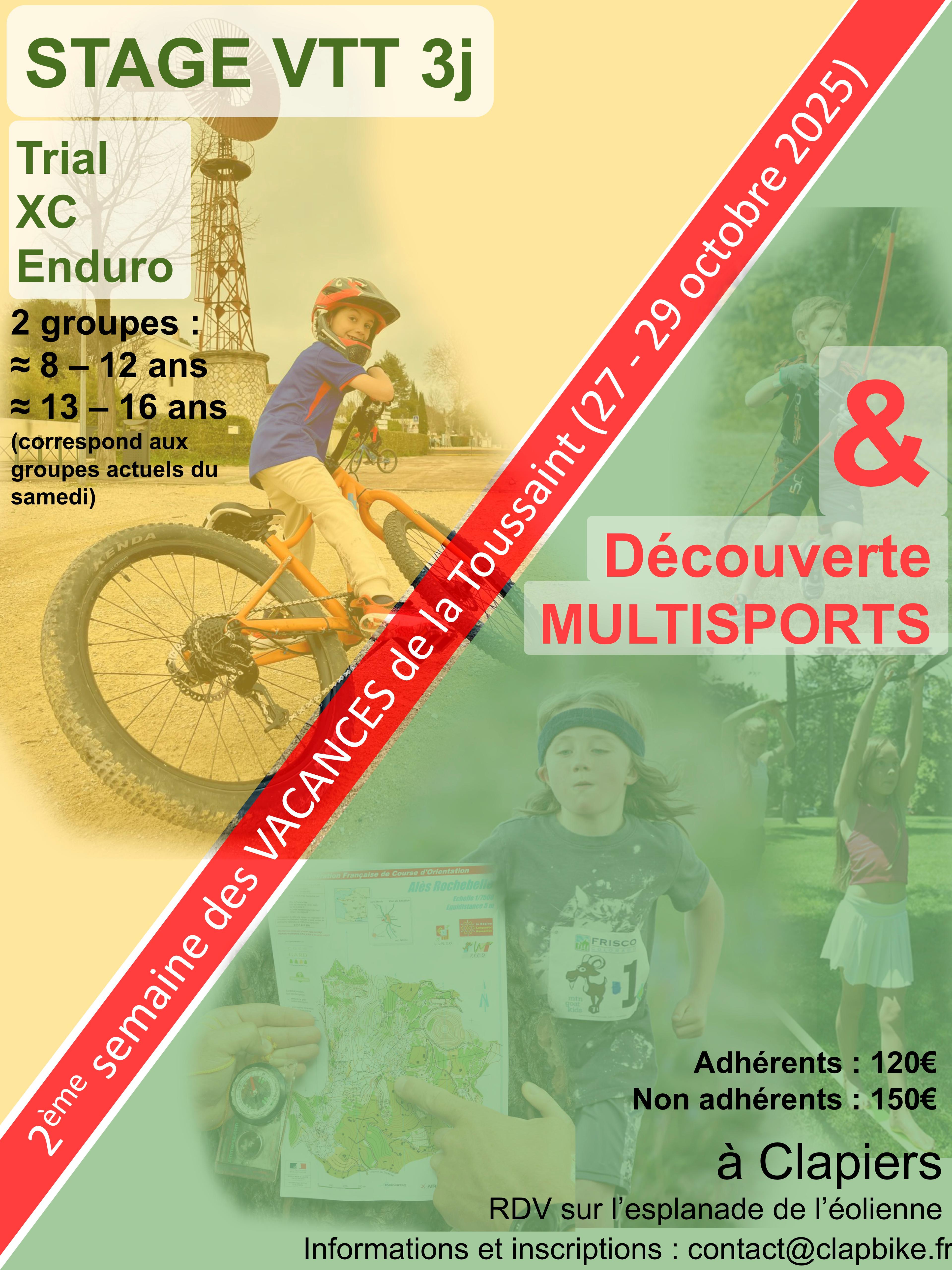 Clap’Bike organise un stage VTT / Multisports (*) de 3 jours à Clapiers pendant la 2ème semaine des vacances de la Toussaint.